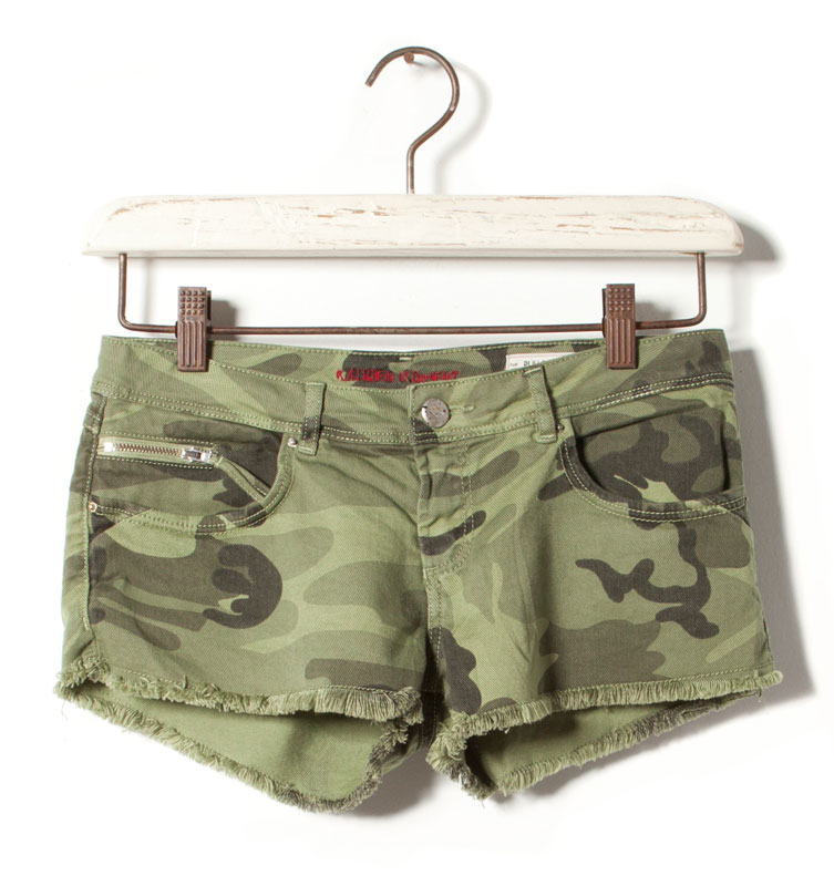 Para las más atrevidas que quieran lucir piernas, los shorts de camuflaje los encontrareis en todos los percheros que, combinados con unos botines una blusa estilo naïf, una cazadora perfecto y un mini shoulder bag, tenéis el outfit para una noche, por ejemplo.